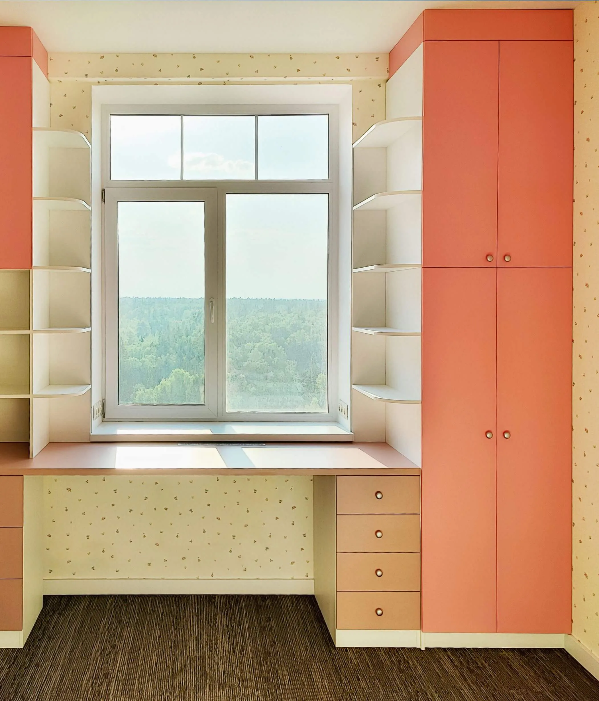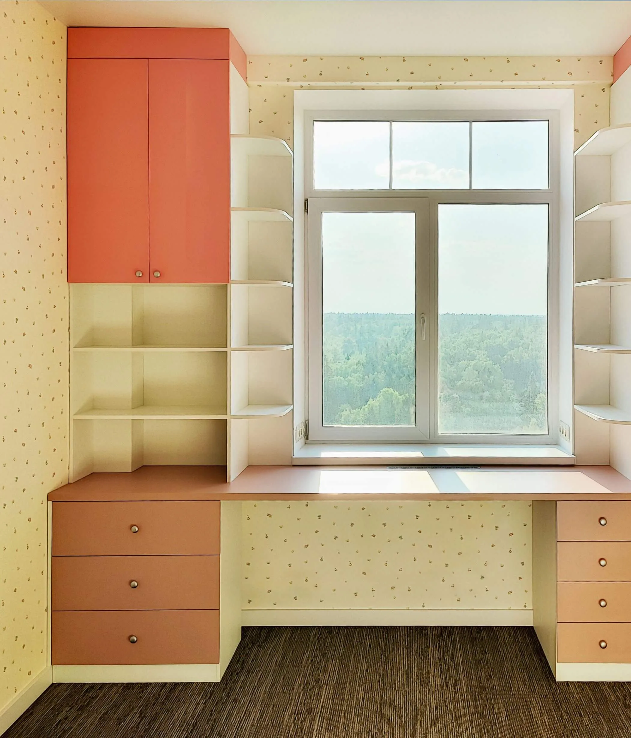 Детская, коллекция ПОЛИ (арт. DPL -01) - стильная мебель для детской в розовых тонах. В набор детской мебели входит рабочая зона, тумбы с выдвижными ящиками, открытые стеллажные полки, закрытие полки, шкаф для одежды с штангами и выдвижными ящиками.